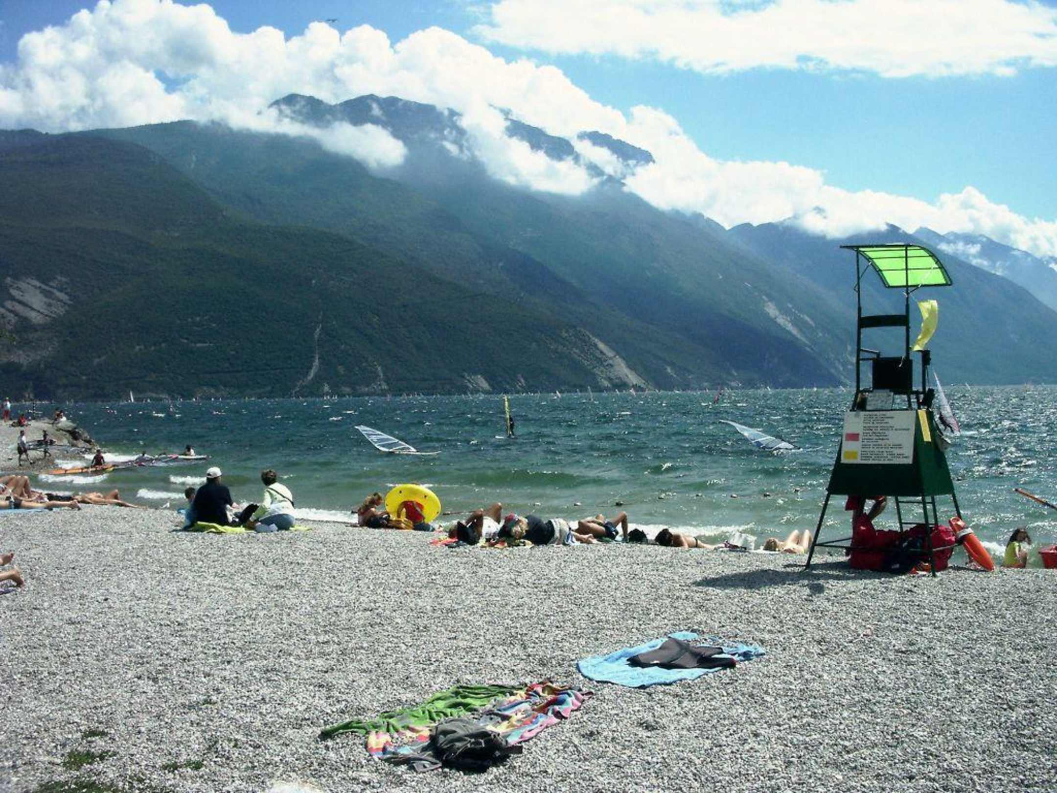 Strand Spiaggia nach linksStrand ca. 300 mtr. entfernt Blick Richtung Torbole / Malcesine mit dem Lifeguard (Salvataggio) im Vordergrund. Ideal für Surfer, andere Badegäste haben weniger was davon, da der Wind ab ca. 13. Uhr recht frisch und stark weht.