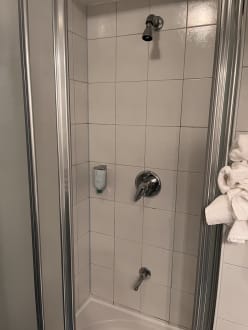 Dusche wie in einem alten Vereinsheim. Keine verstellbarer Duschkopf auf einer Höhe von ca. 1,8m.