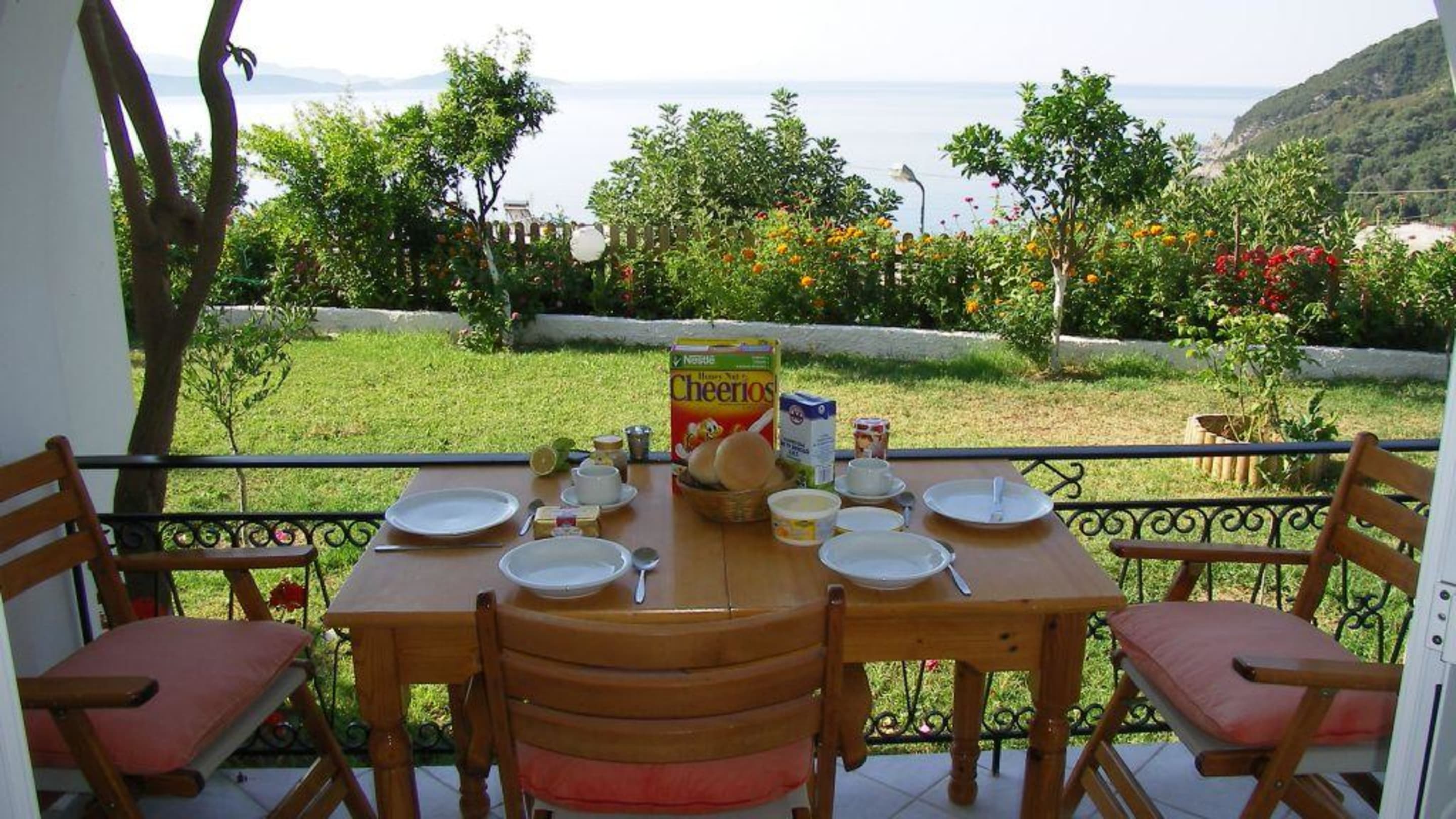 Balkon mit Blick in den Garten und aufs Meer