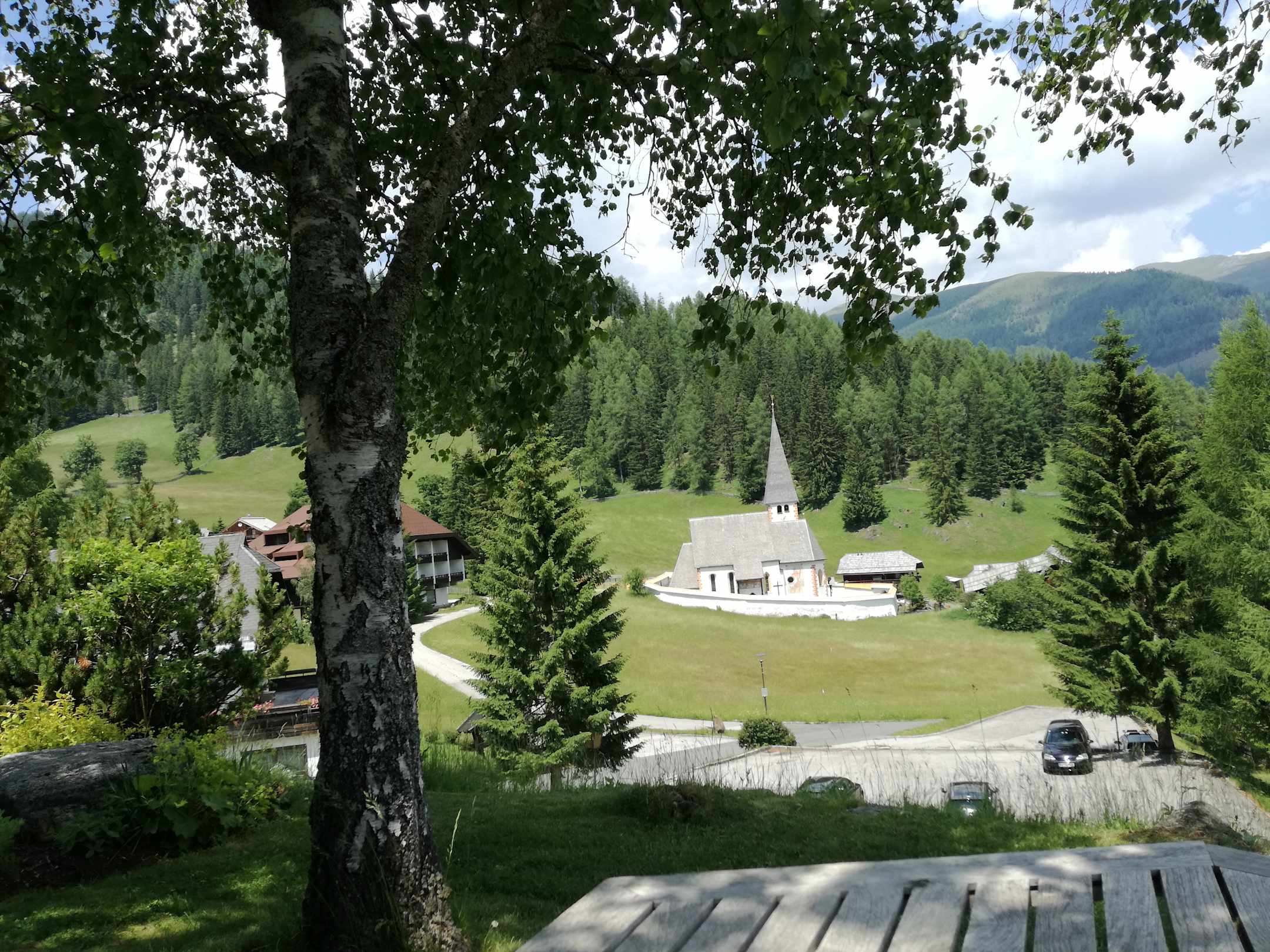 Blick auf die Kirche St. Oswald vom Hoteleingang aus.