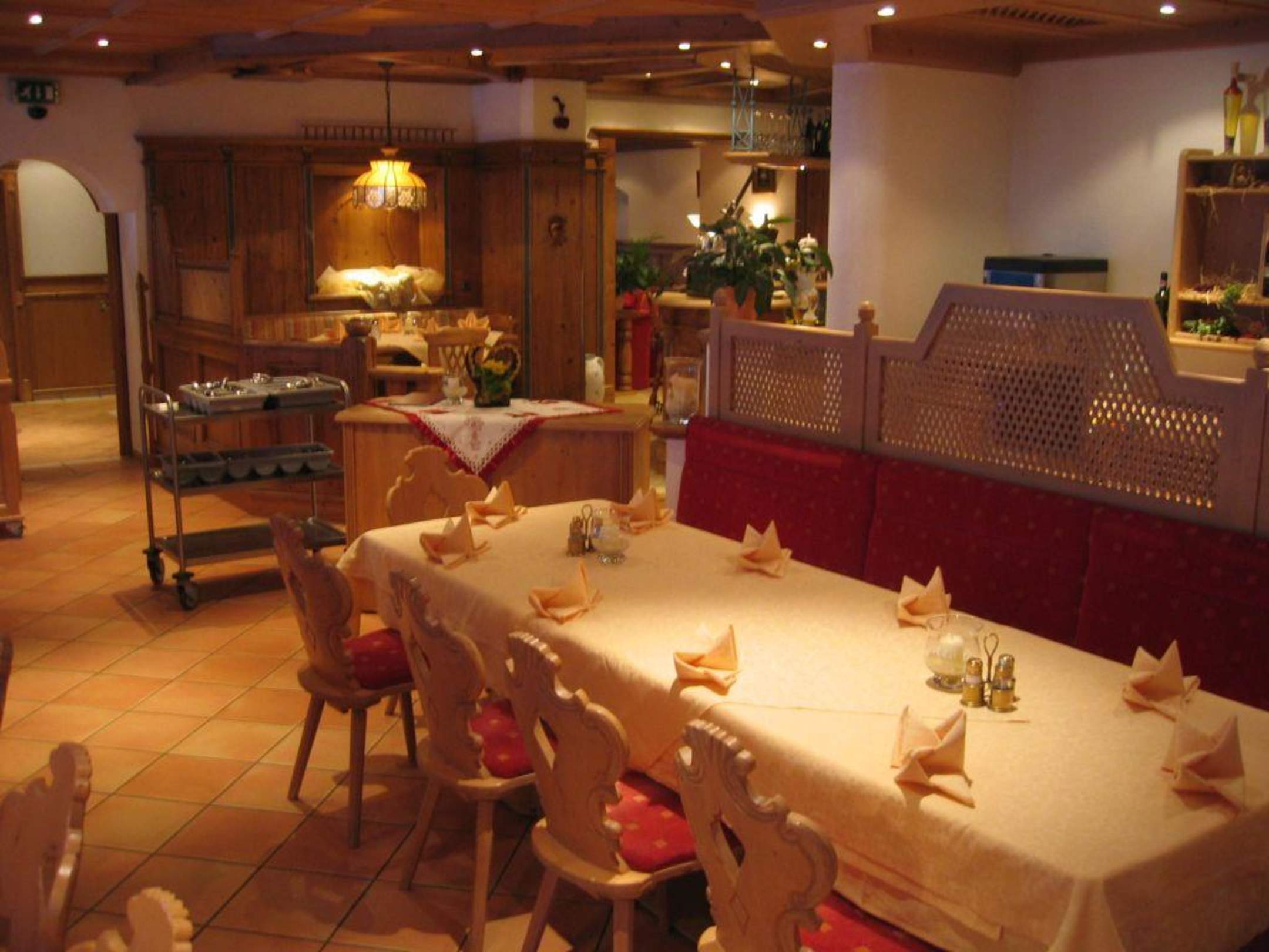 Das Foto habe ich Nachmittags gemacht, als die Gäste alle skifahrwn waren. Das Gänge-Menue wird abend sehr stilvoll vom Kellner serviert.