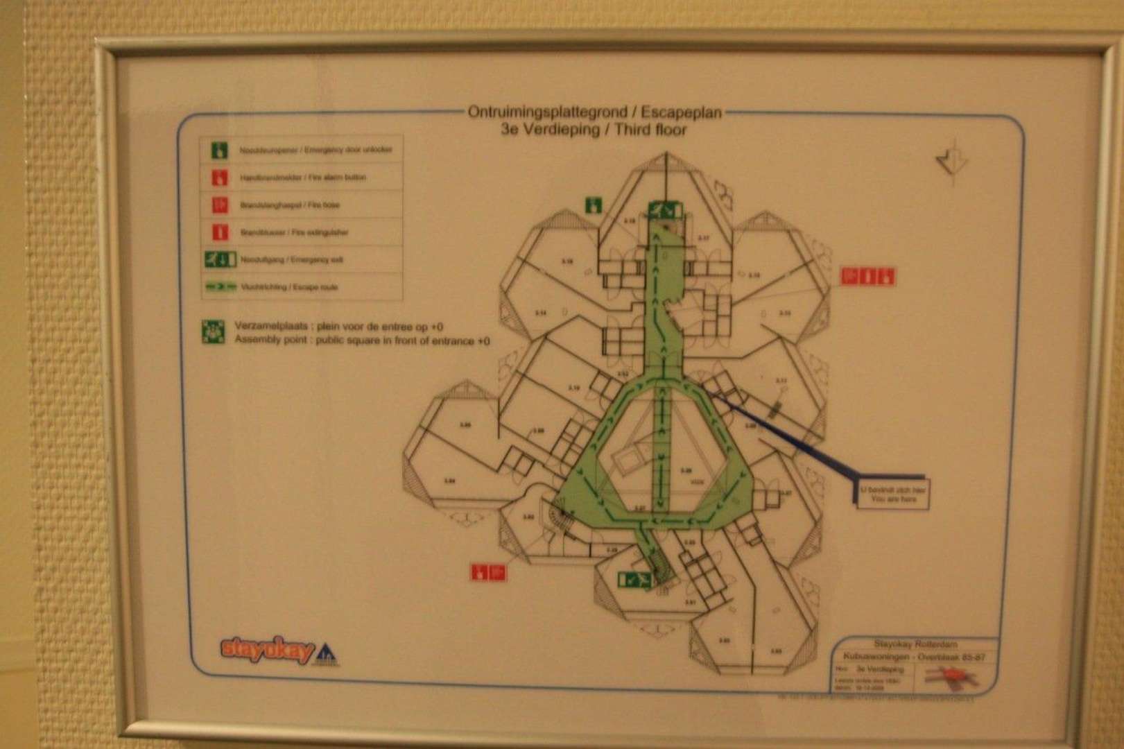 Крайне оригинальный план эвакуации. Кубики внутри сгруппированы таким образом, что технические и общественные помещения равномерно съедают лишь небольшую часть от каждого куба. Один лифт - на 10 кубов.