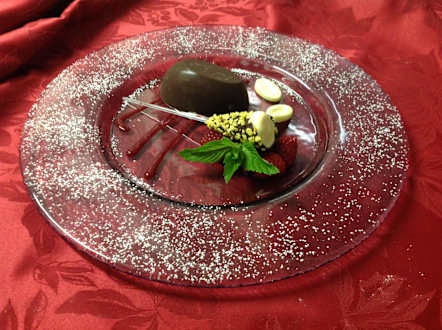 Il bauletto di cioccolato con semifreddo alla grappa di nocciole accompagnato dal cornetto con gelato allo zenzero e piccolo cioccolatino ripieno di crema chantilly su frutti di bosco marinati