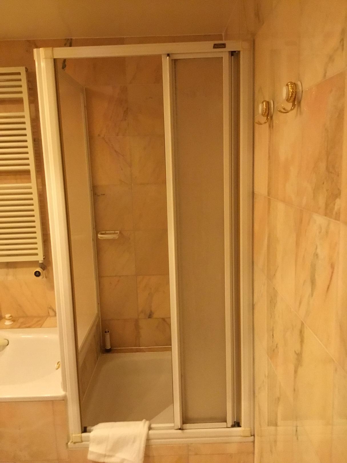 Doppelzimmer mit französischen Balkon. Blick auf die Dusche.