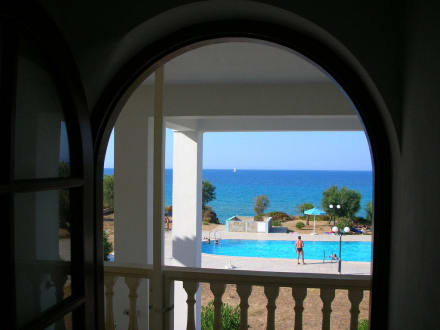 Ausblick vom Hotelflur auf Pool und Meer