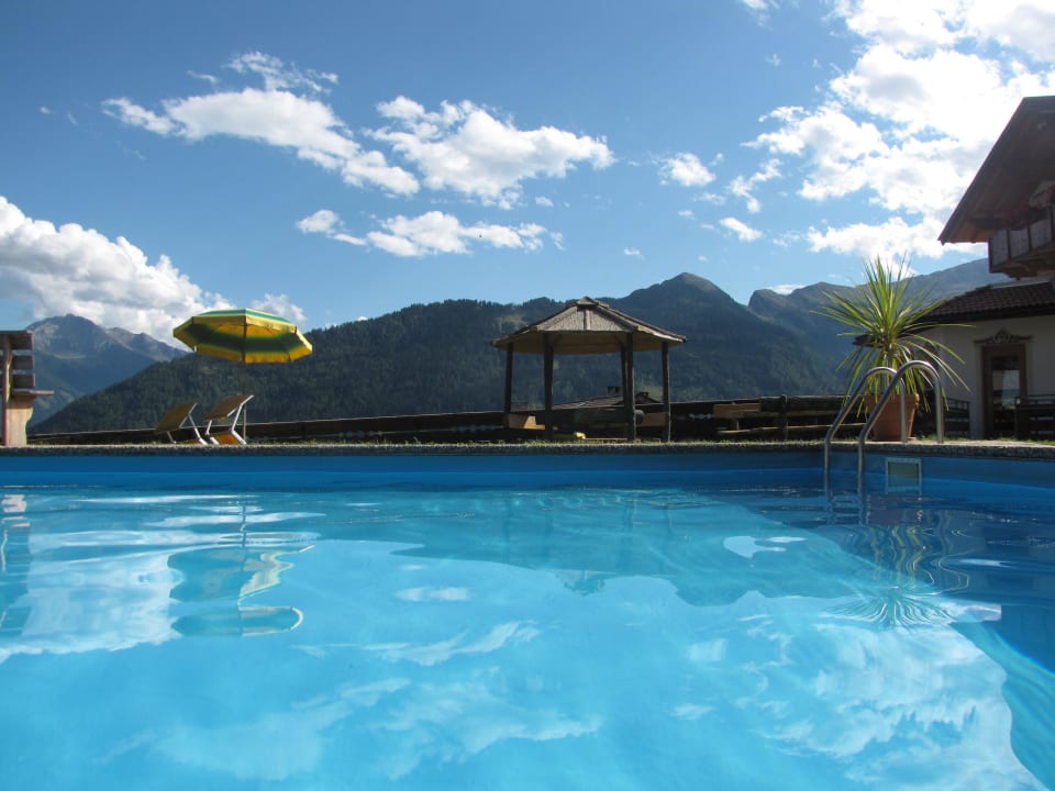 Blick aus dem Pool des Stullerhofs auf die Berge