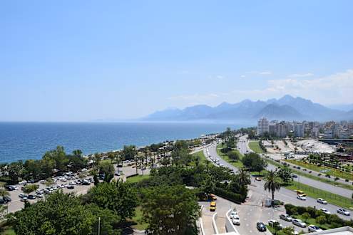 Ausblick von unserem Hotelzimmer im obersten Stockwerk in Richtung Meer und Gebirge