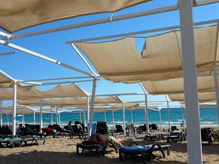 Hier Zeltdach, im Süral Garden und Süral Saray einzelne festmontierte Sonnendächer aus Holz