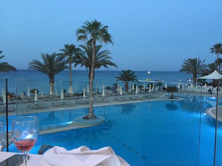 Ausblick von der Abendessen-Terrasse auf einen der Pools und das Meer.