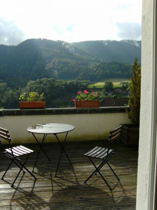 Blick aus dem Zimmer über den Balkon auf die Berge