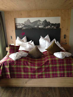 Gipfelstürmersuite erhöhtes BettErhöhtes Bett (leichter Ein-/Ausstieg) mit direktem Blick vom Bett aus auf die Berge
