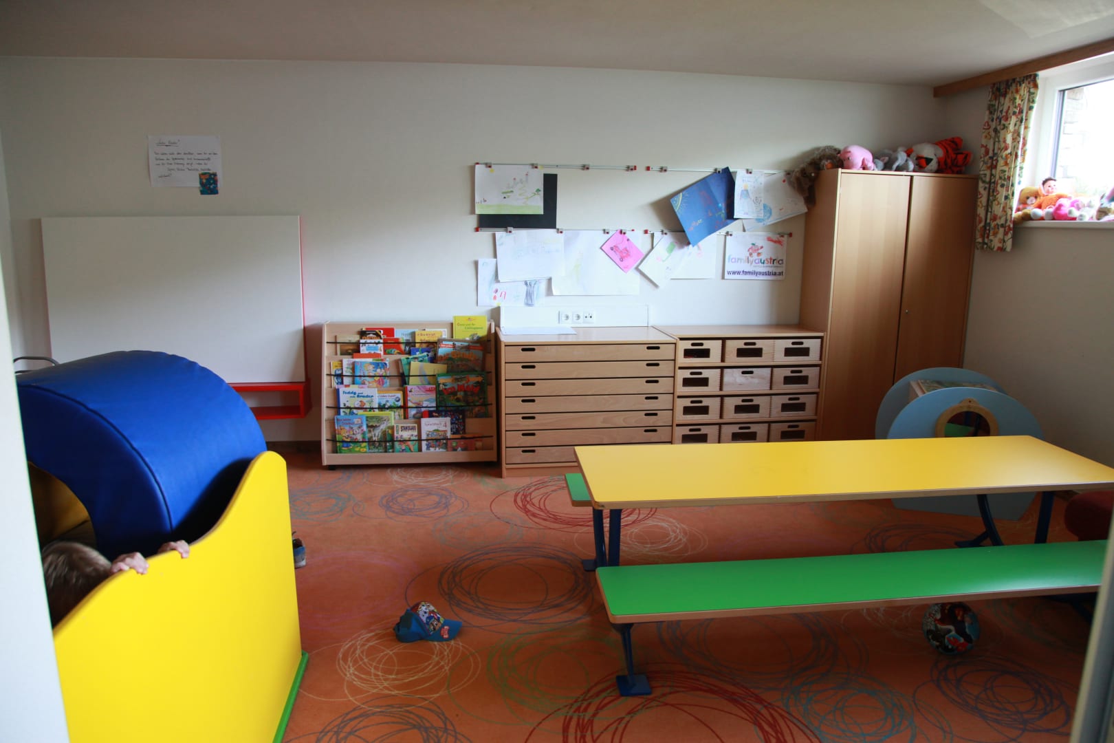 Hinterstes Spielezimmer für die Kinder - durch eine Glasscheibe vom Raum mit Tischtennisplatte und Airhockey getrennt. Meinem Sohn (9) gefiel vor allem die "Bauecke" links mit den riesigen Schaumstoffbausteinen.