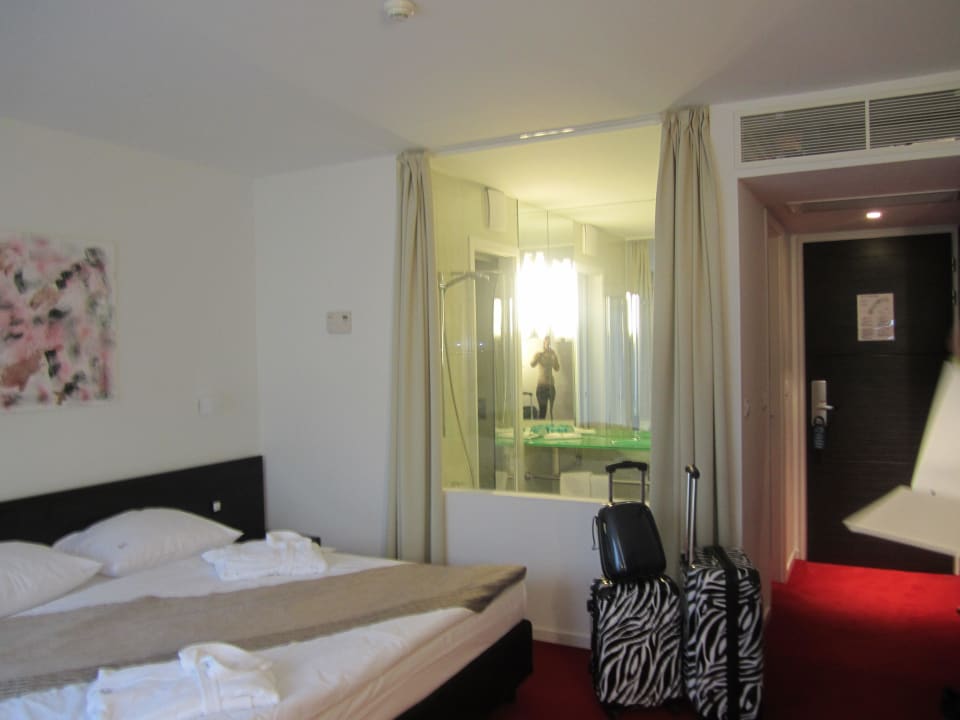 Doppelzimmer mit Glasscheibe zum Badezimmer