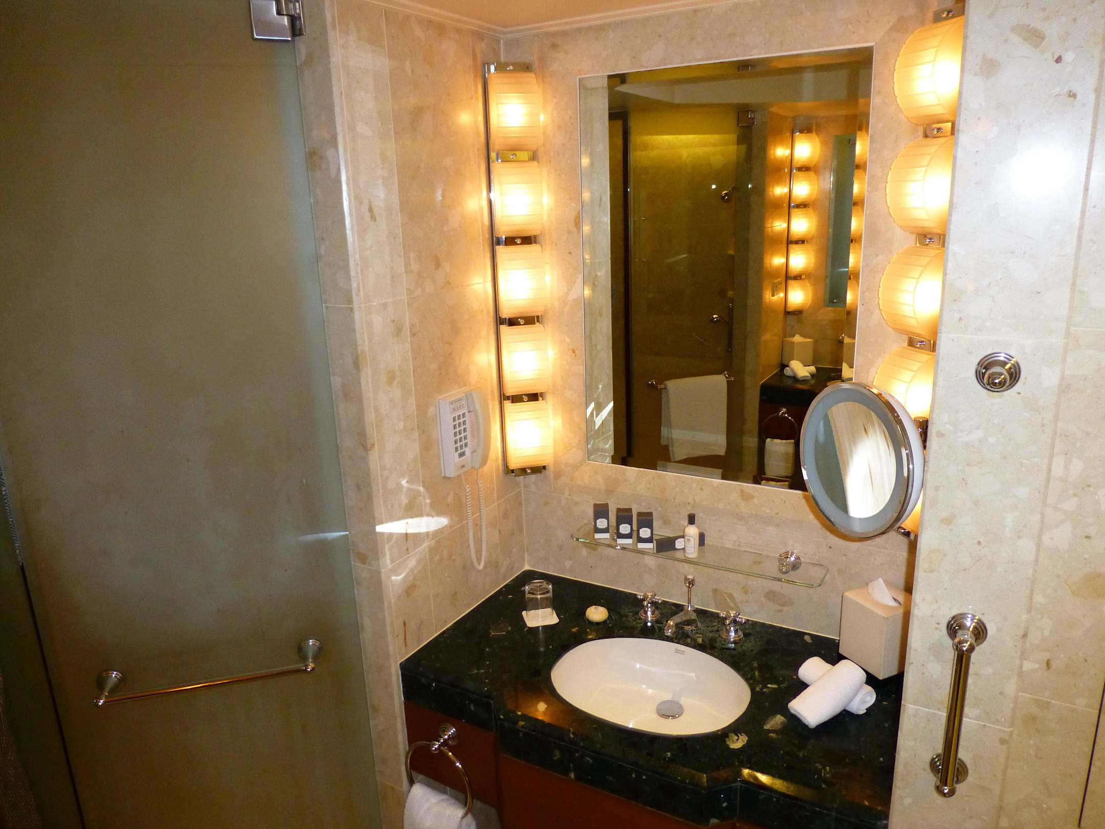 Badezimmer linke SeiteDas Badezimmer in Marmor hat jeweils rechts und links ein Waschbecken sowie eine grosse Dusche und eine Badewanne