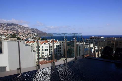 Blick von der Dachterrasse des Hotels auf Funchal