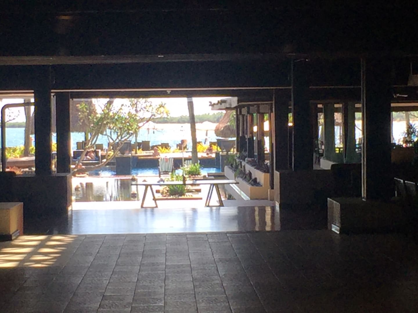 Blick von der Rezeption in Richtung Pool und Strand