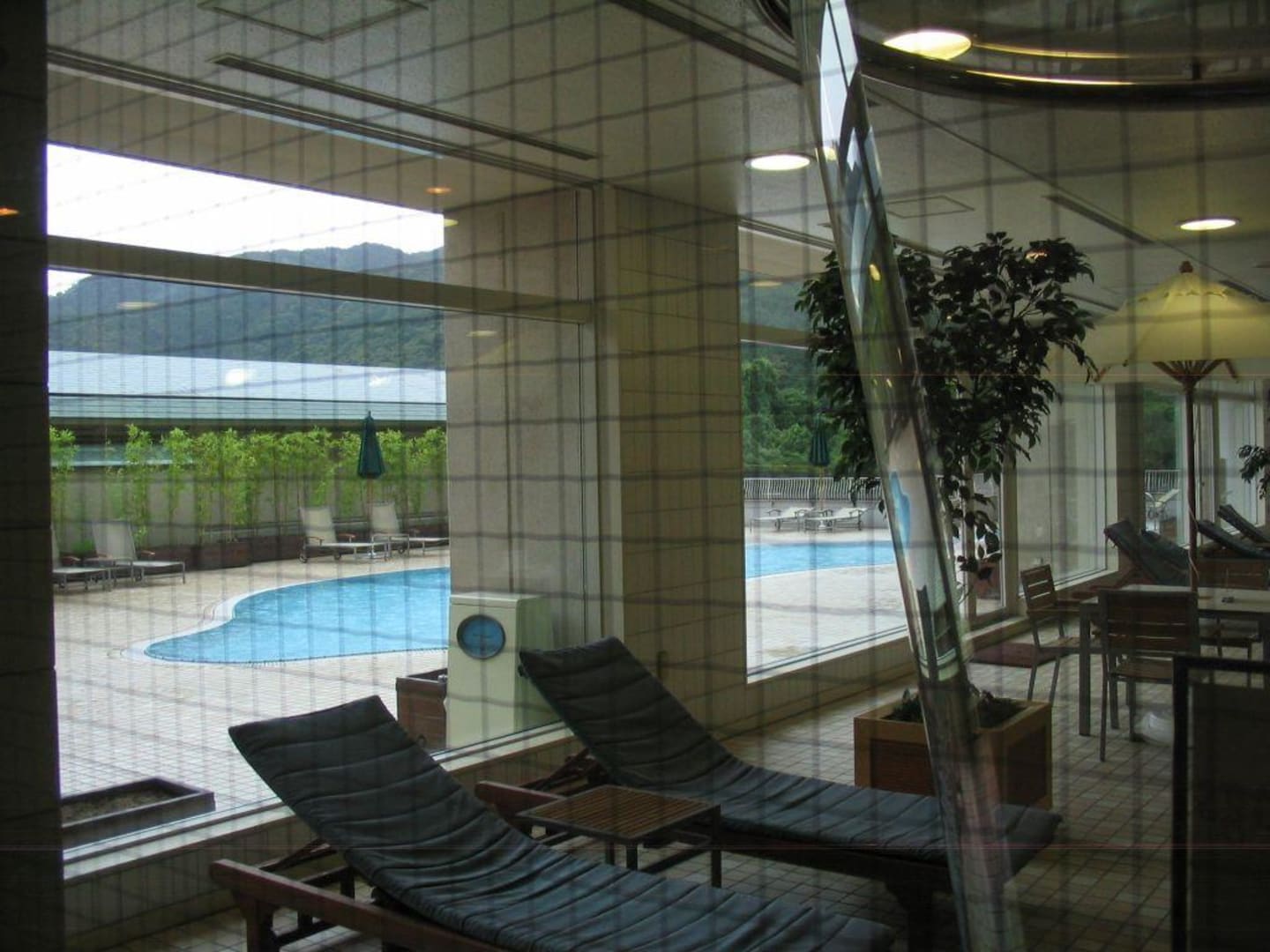 Blick zum Aussenpool bei Regen