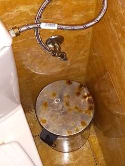 Rostigen Mülleimer in der Herrentoilette hinter der Lobby-Bar austauschen