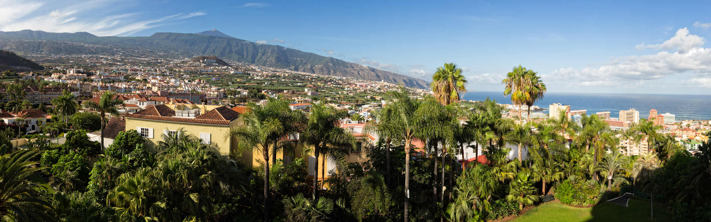Blick vom Zimmerbalkon: Orotavatal, Teide, Puerto de la Cruz, Atlantik