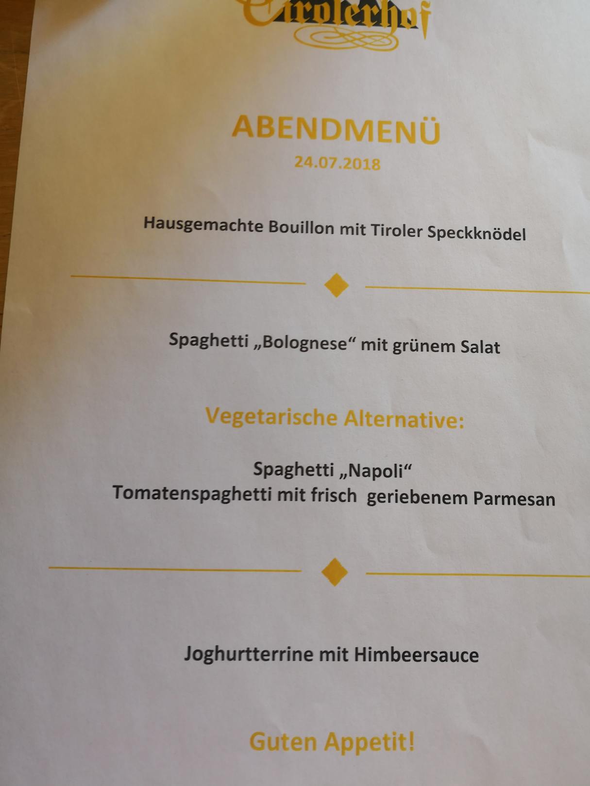 Beispiel eines Abendmenüs All-inclusive. Für zahlende Gäste wird es als Tagesmenü für 16 Euro angeboten.
