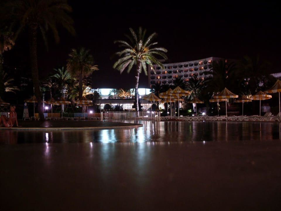 Widok na hotel tour khalef, basen i ogródZdjęcie zrobione wieczorową porą tuż przy basenie. W tle hotel z pięknym ogrodem palmowym