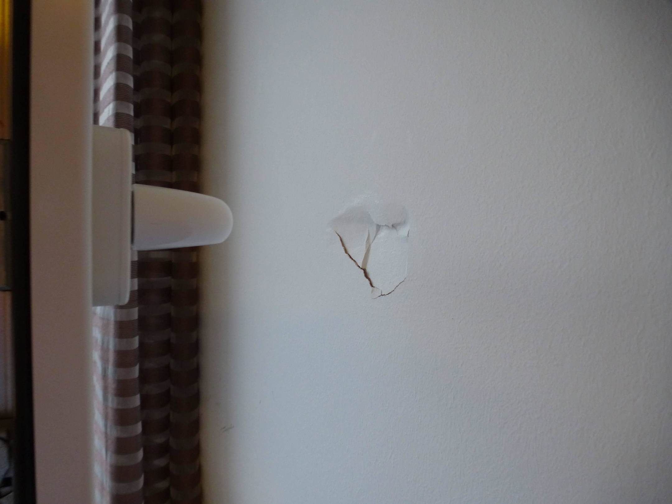 Da in mehreren Zimmern verpasst wurde, Stopper für die Fenstergriffe an den Wänden zu befestigen, kann man regelmäßig diese manchmal intensiveren "Eindrücke" oftmals bestaunen.