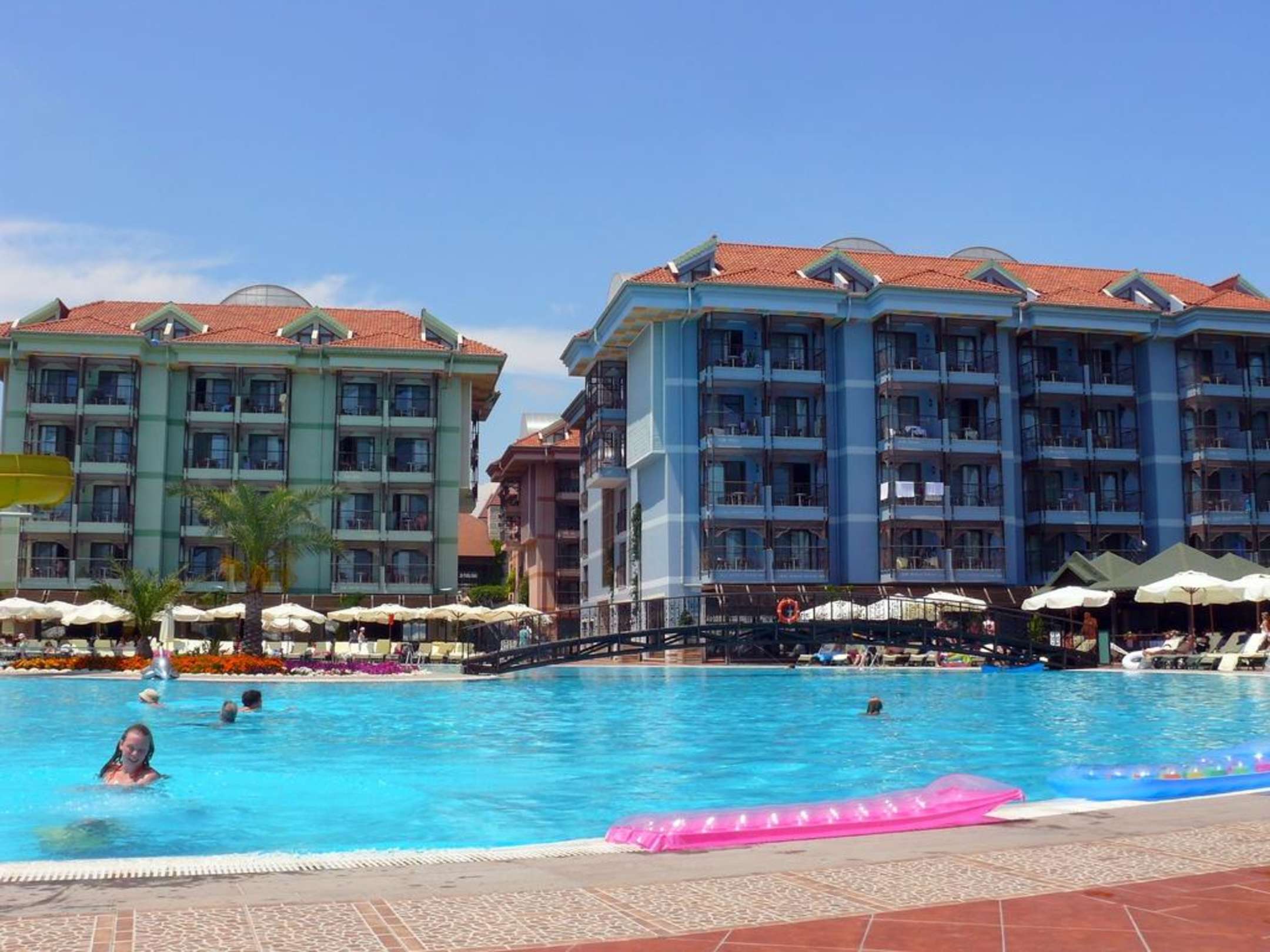 Blick vom Pool auf das HotelHerrlicher Blick vom Pool auf unser Zimmer im 4 Stock (linkes Bild, zweite von rechts)
