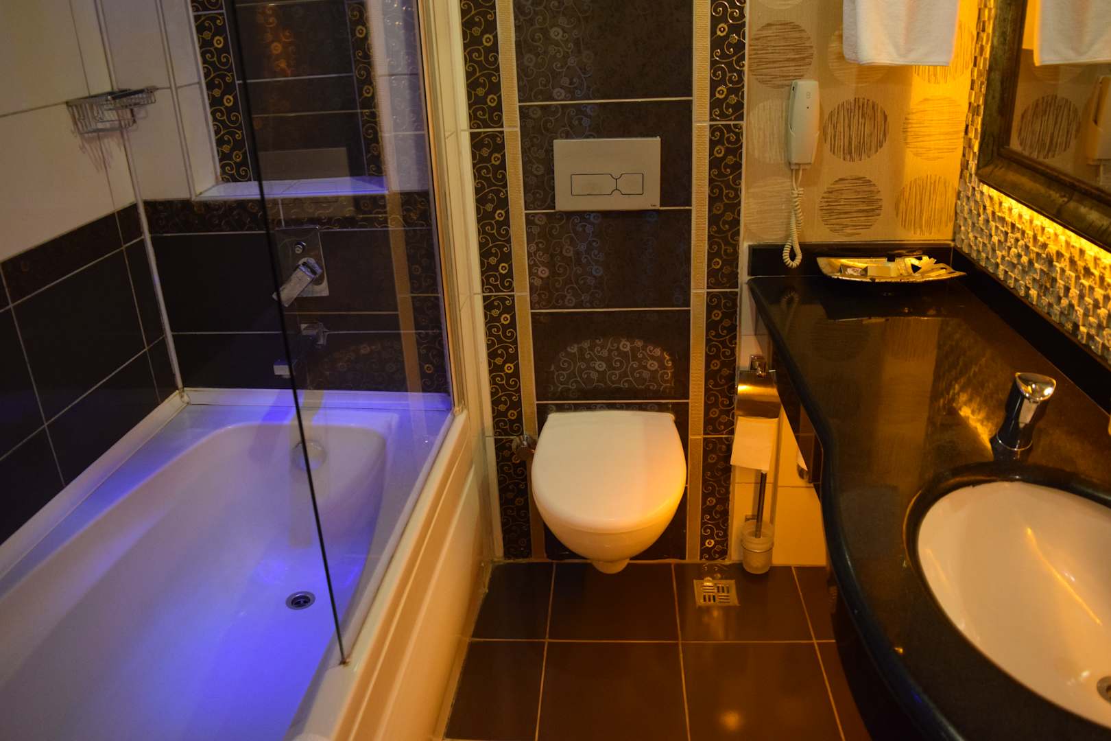 Badezimmer mit Wanne, WC und Waschtisch
