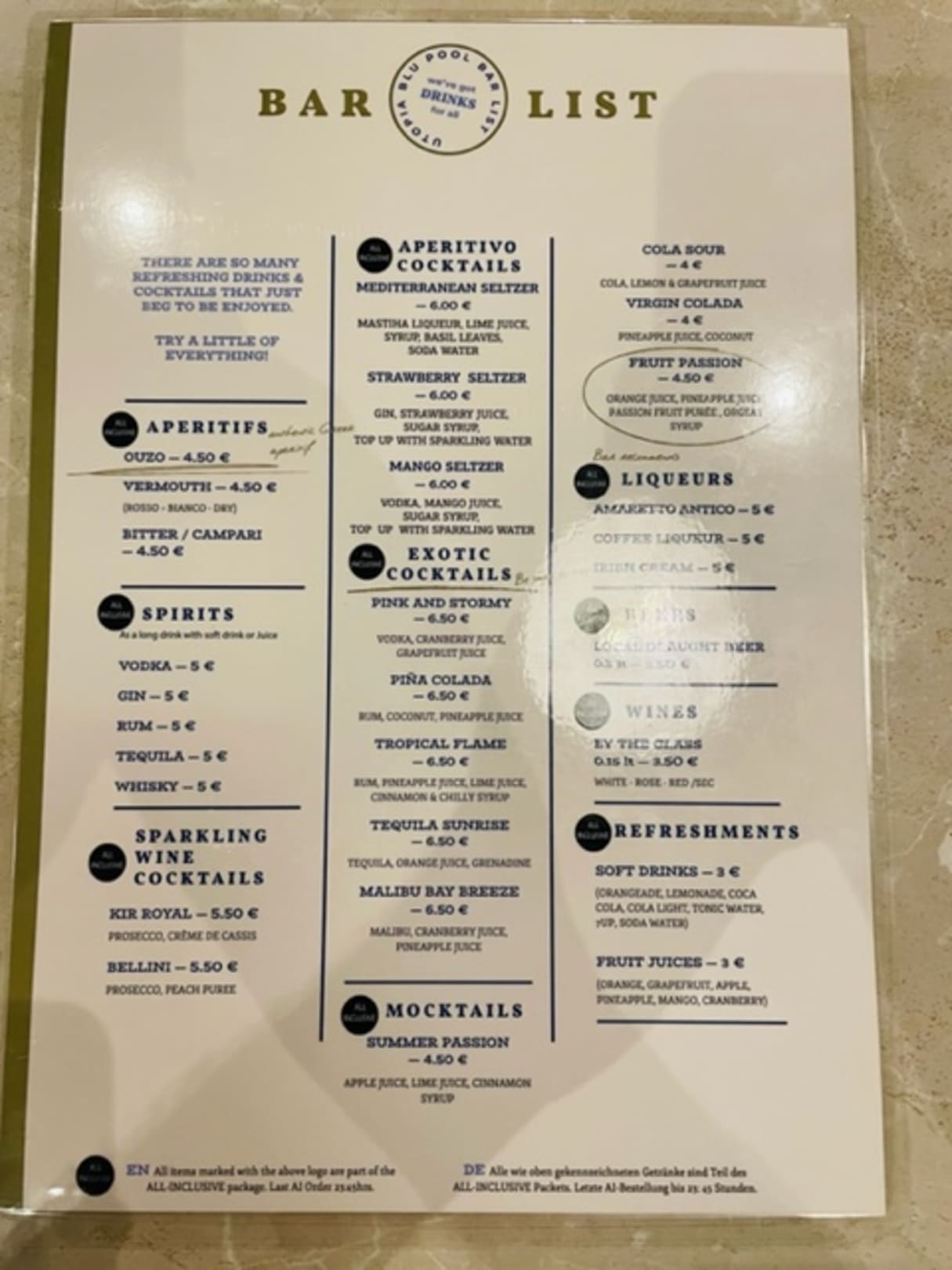 Getränkekarte Poolbar