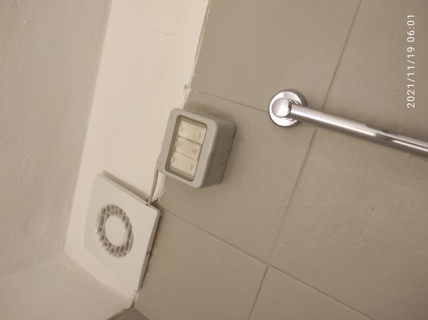 Strom innerhalb der Dusche unsachgemäß installiert, das ist gefährlich, die Blende des Ventilators liegt nicht mal an der Wand an, an Oberseite offene Kabel zu erkennen.