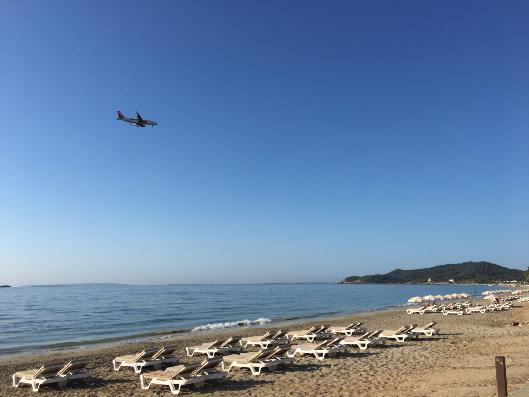 Strand vor dem Hotel mit omnipräsentem Flugzeug im Landeanflug