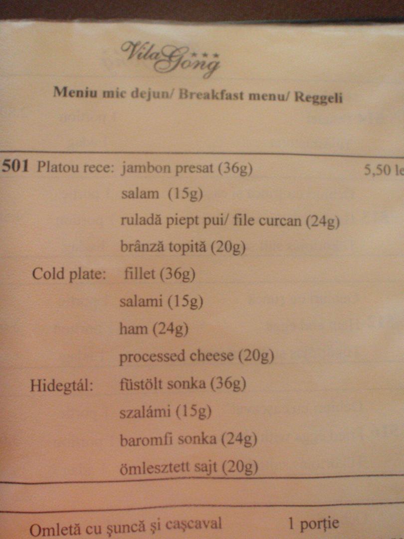 Menu Hotel Vila Gong