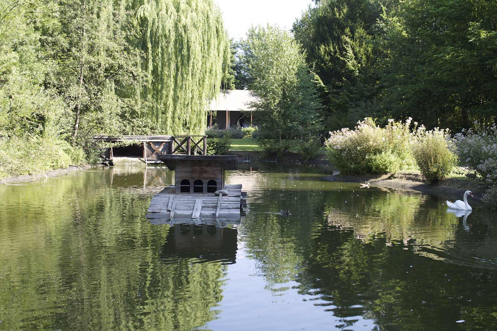 Blick vom Schwanenteich zum Zelt