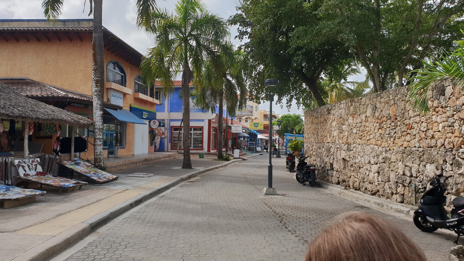 kleine Straße mi vielen kleinen Öäden, rechts die Hotelmauer