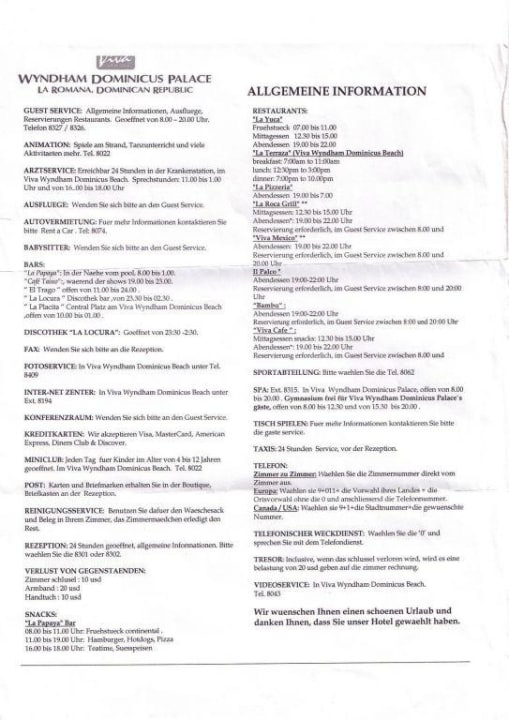 Öffnungszeiten und Telefonnummern der einzelnen Einrichtungen wie Restaurants und so.....