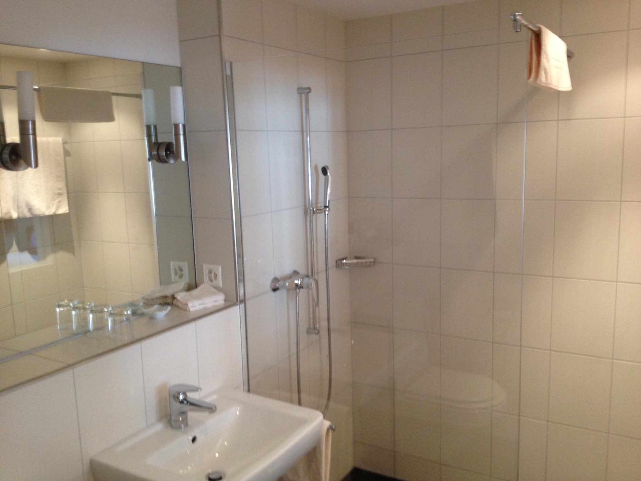 BadezimmerGroßzügiges Bad mit WC (Closomat), Waschtisch, bodengleiche Dusche und Tageslicht übers das Fenster zum Zimmer