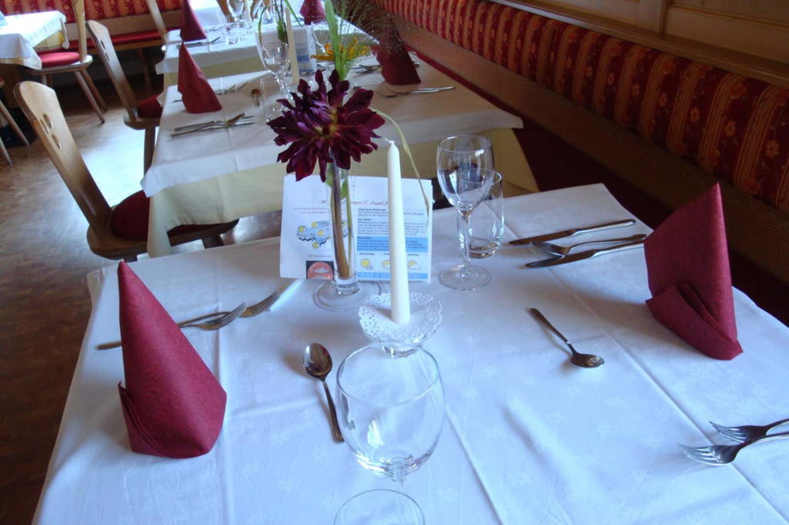 2 x täglich festlich gedecktJeden Morgen befand sich eine hoteleigene Zeitung auf dem Tisch. Mit dem Abendmenü., dem Witz des Tages, Horoskop, Ausflugsziele, das aktuelle Wetter in der Region sowie die Vorhersage, ein Spruch des Tages und Wandertipps.