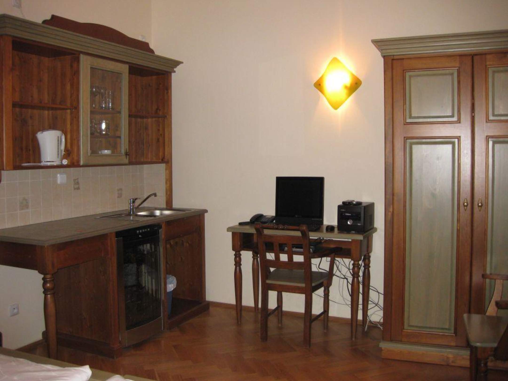 ZimmerHier sieht man das TV / Internetgerät, sowie die Spüle (links) und den Kleiderschrank mit Safe (rechts).