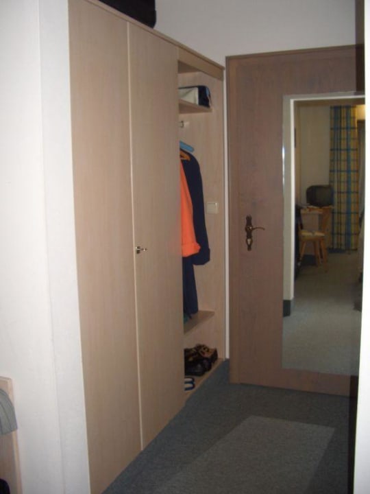 Zimmer - im Schrank genügend Ablage- und Aufhängemöglichkeiten. Großer Spiegel an der Zimmereingangstüre. Im Spiegel ist der Schreibtisch und das TV-Gerät zu sehen.