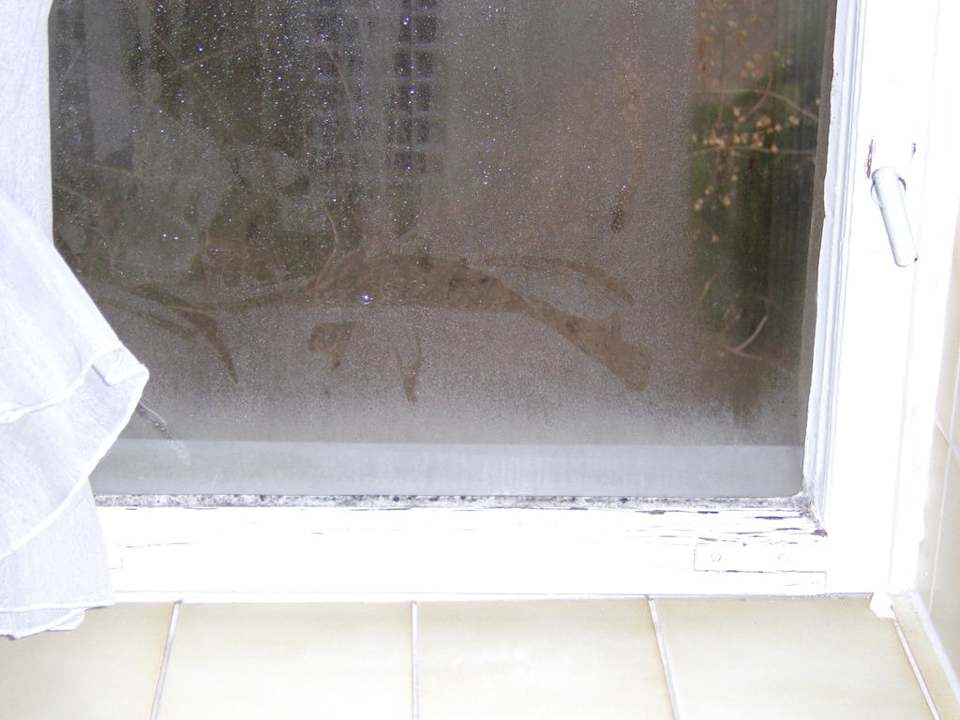 Schimmelige Fenster im Bad, abgedichtet mit Küchenpaier