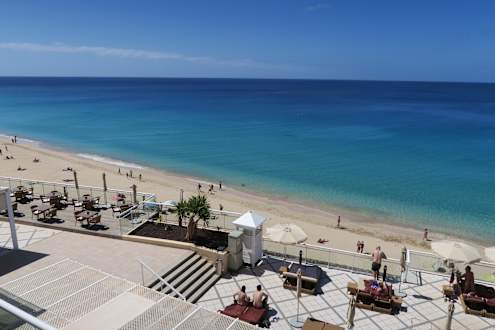 Ausblick von unserem Balkon aus auf Poolanlage und Strand