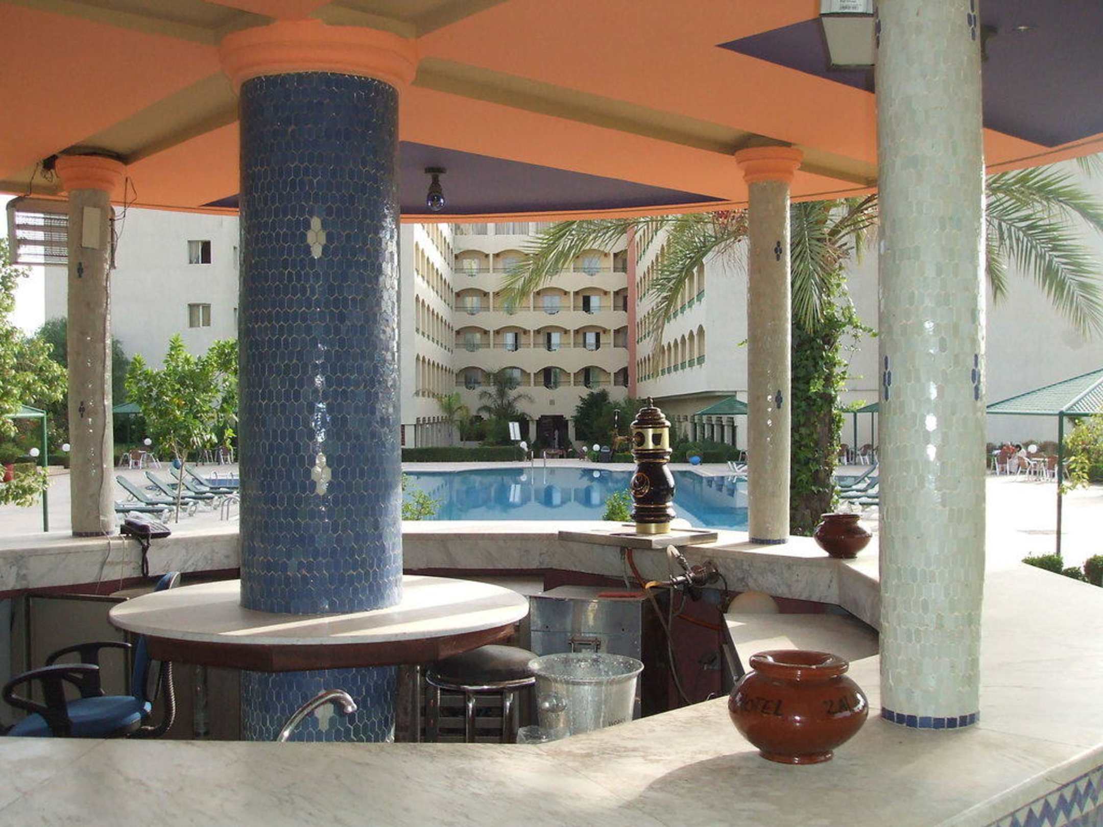 Dieser Bilderausschnitt zeigt einen Teil der Bar am großen Swimming Pool (im Mittelgrund) vom Hotel Zadagh Parc Palace. Im Hintergrund ist ein Teil des Hotels zu erkennen.