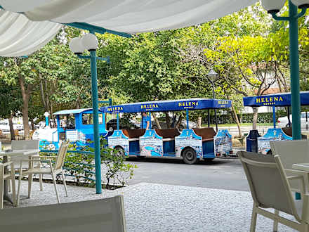 Direkt vor dem Hotel hält die Bimmelbahn die zur Vergnügungsmeile fährt . Einfach sitzenbleiben bis zur Endstadion . Nach Party und Vergnügen fährt sie an dieser Stadion wieder zurück.