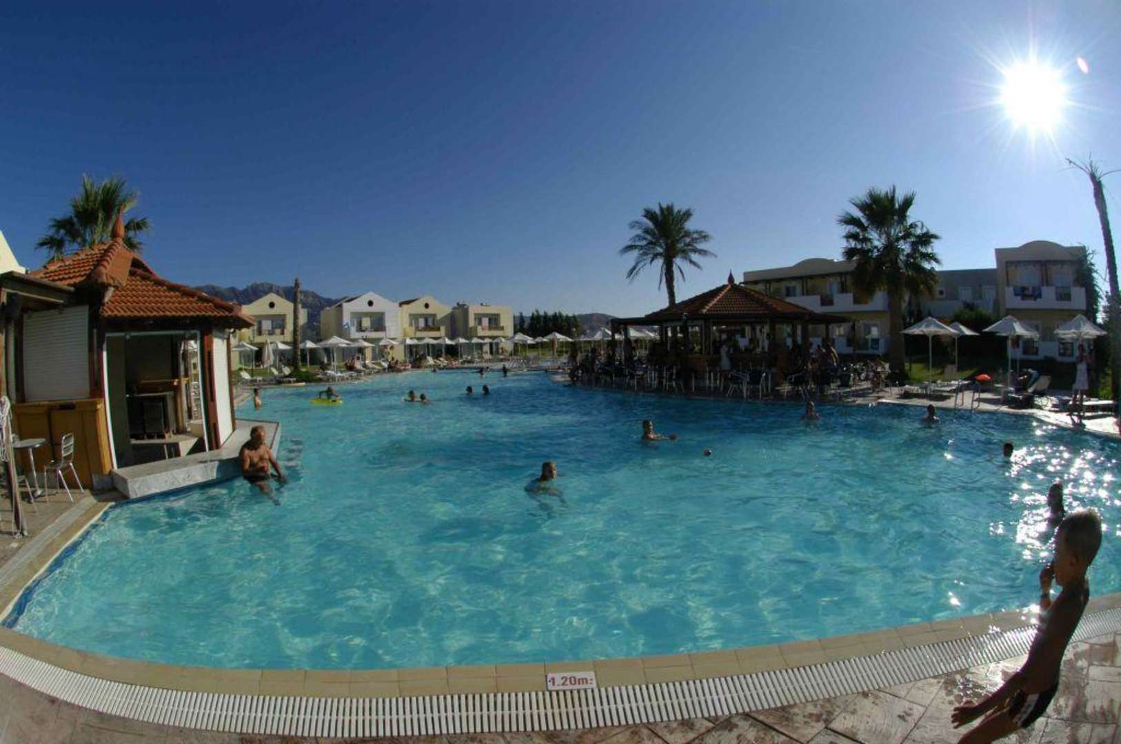 Hauptpool (Nichtschwimmerbereich) mit den beiden Bars. Die Musik an der Poolbar war teils nervend oder zumindest unpassend: Hardrock & Heavy Metal - auf Wunsch aber auch mal etwas Griechisches.