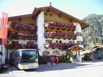 Herrliche Blumenpracht am Hotel "Zum Holzknecht" in Neustift-Milders im Stubaital.