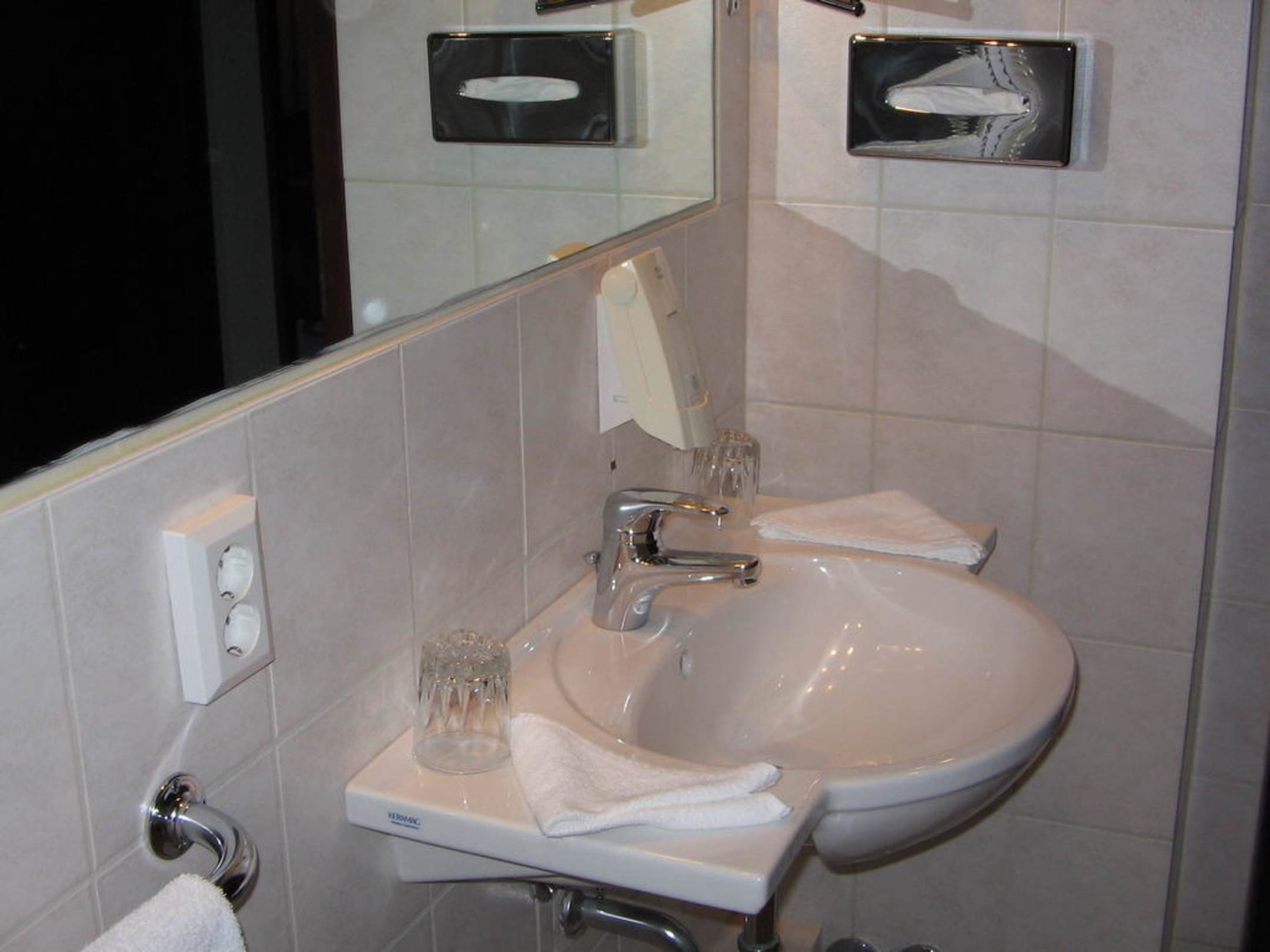 mit Waschlappen, ausreichend Handtüchern sowie Fön und Handtuchhalterheizung