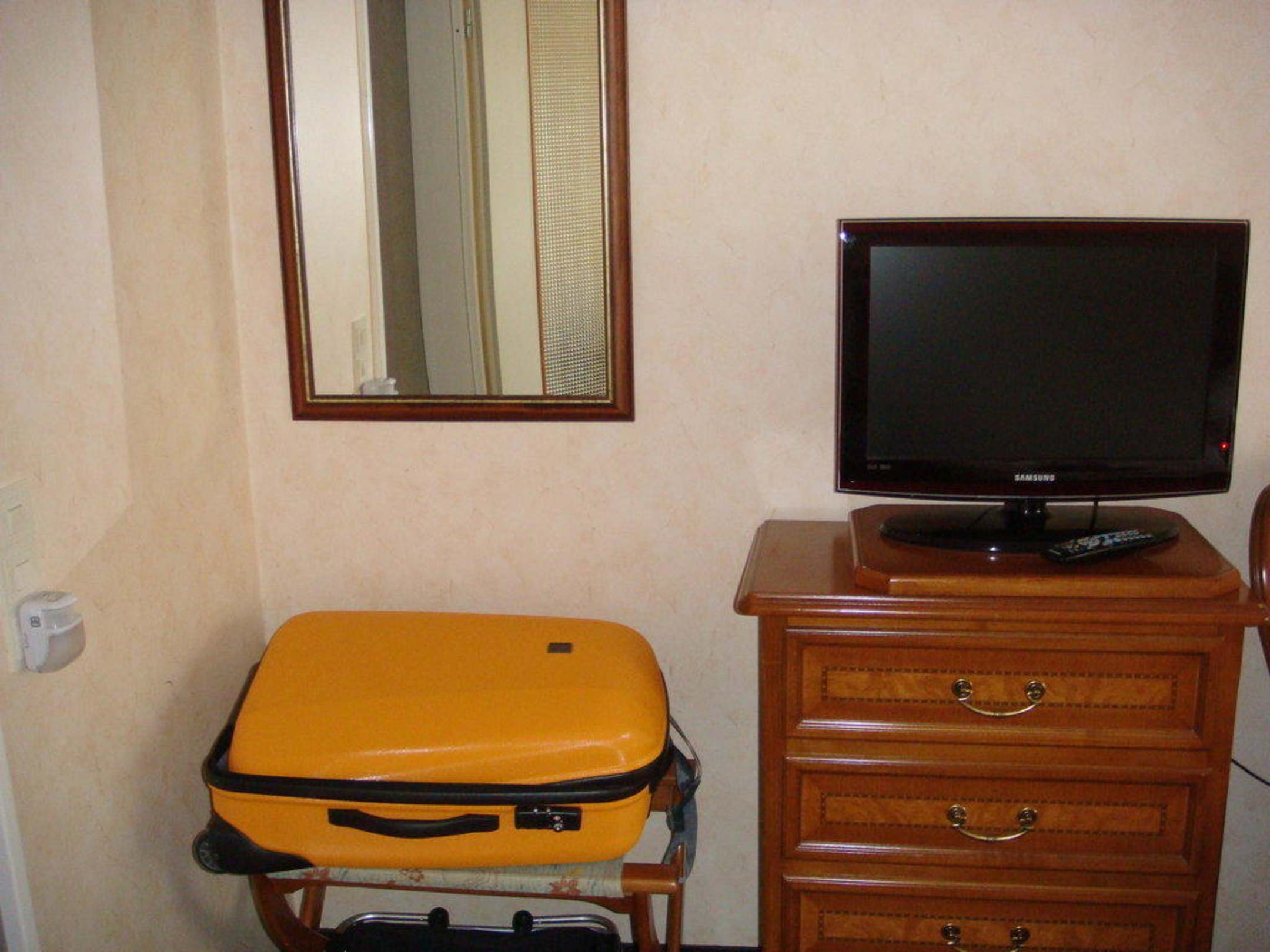 AusstattungHier sieht man den Fernseher auf einem drehbaren Untergestell. Eine praktische Kofferablage und einen recht grossen Spiegel.