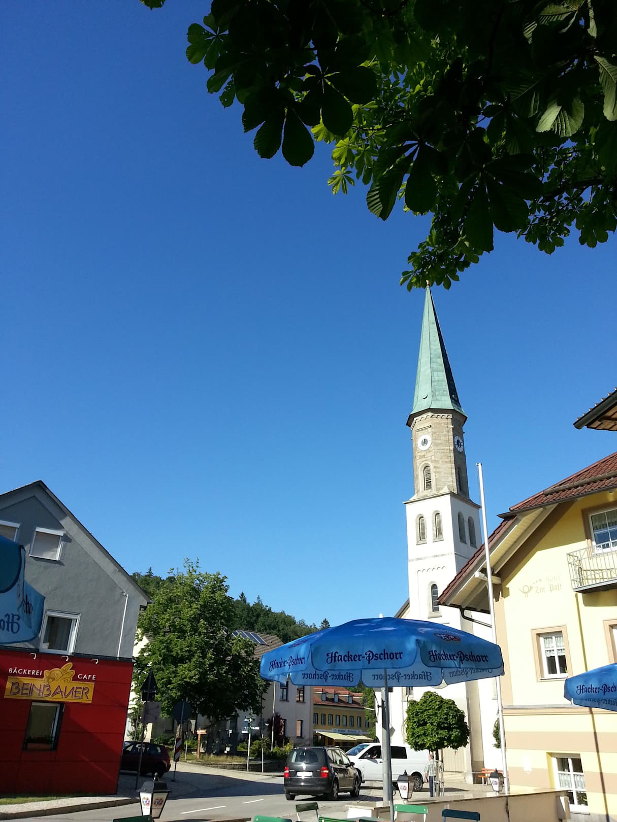 Blick vom Biergarten auf den Marktplatz