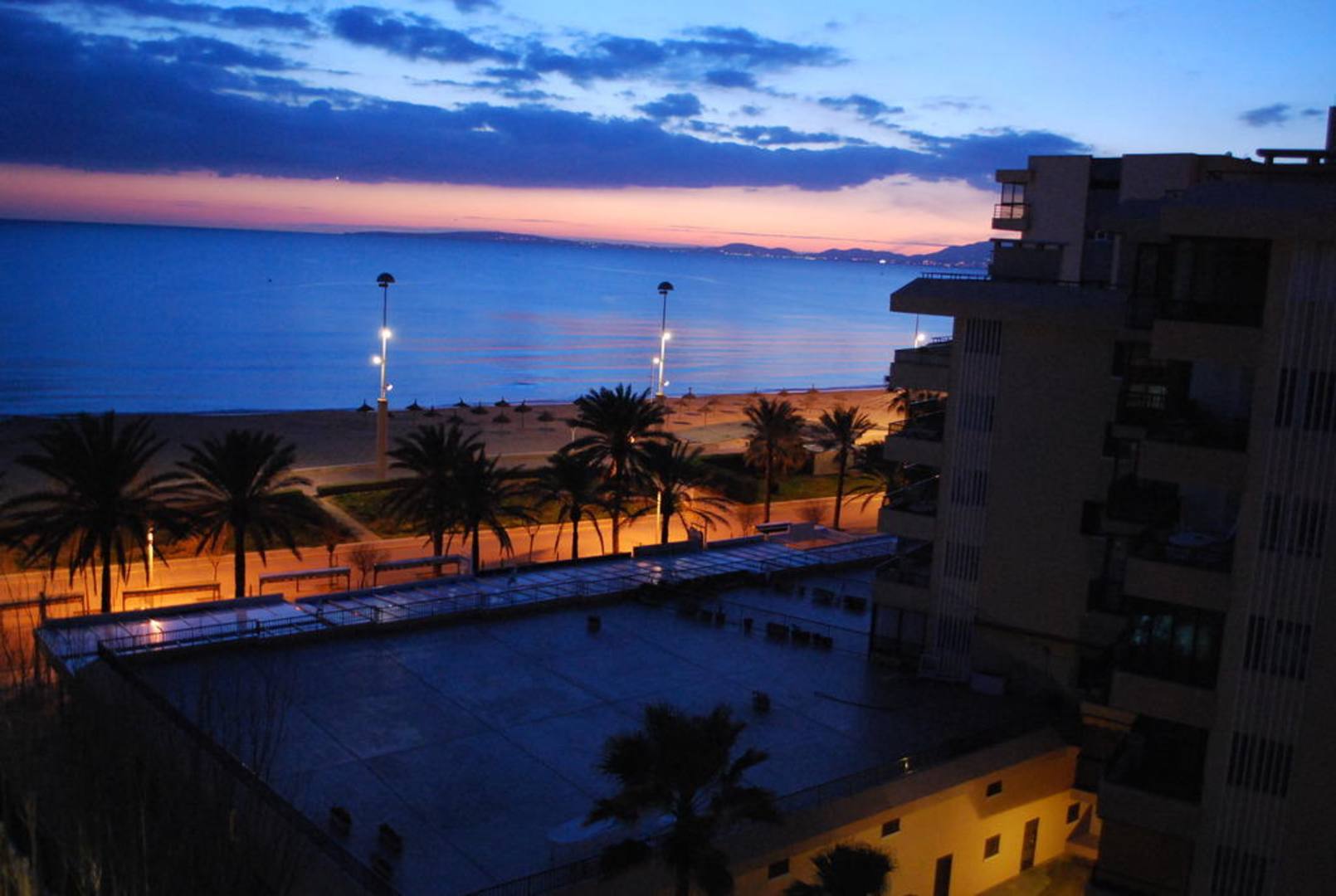 Ausblick vom Balkon auf den Strand nach Sonnenuntergang.