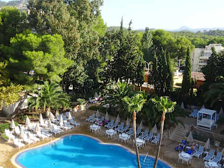 Der Pool mit vielen Schattenspendenden Bäumen.